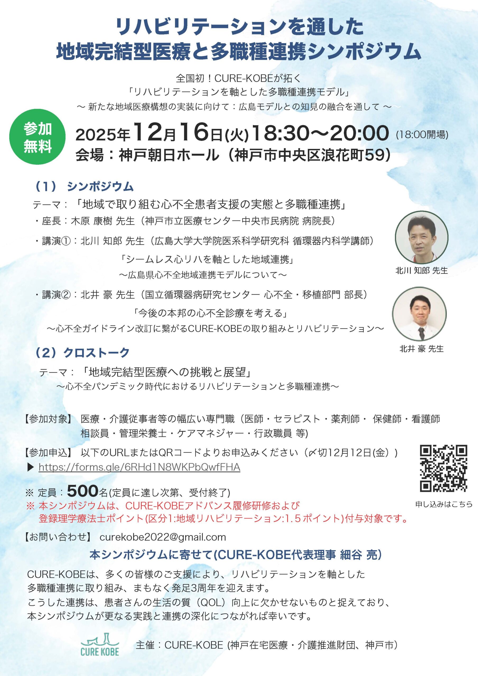 平素より CURE-KOBE の取組に格別のご支援とご理解を賜り、心より御礼申し上げます。このたび、CURE-KOBE設立3周年を迎えるにあたり、神戸在宅医療・介護推進財団および神戸市主催により、「リハビリテーションを通した地域完結型医療と多職種連携シンポジウム」 を開催いたします。