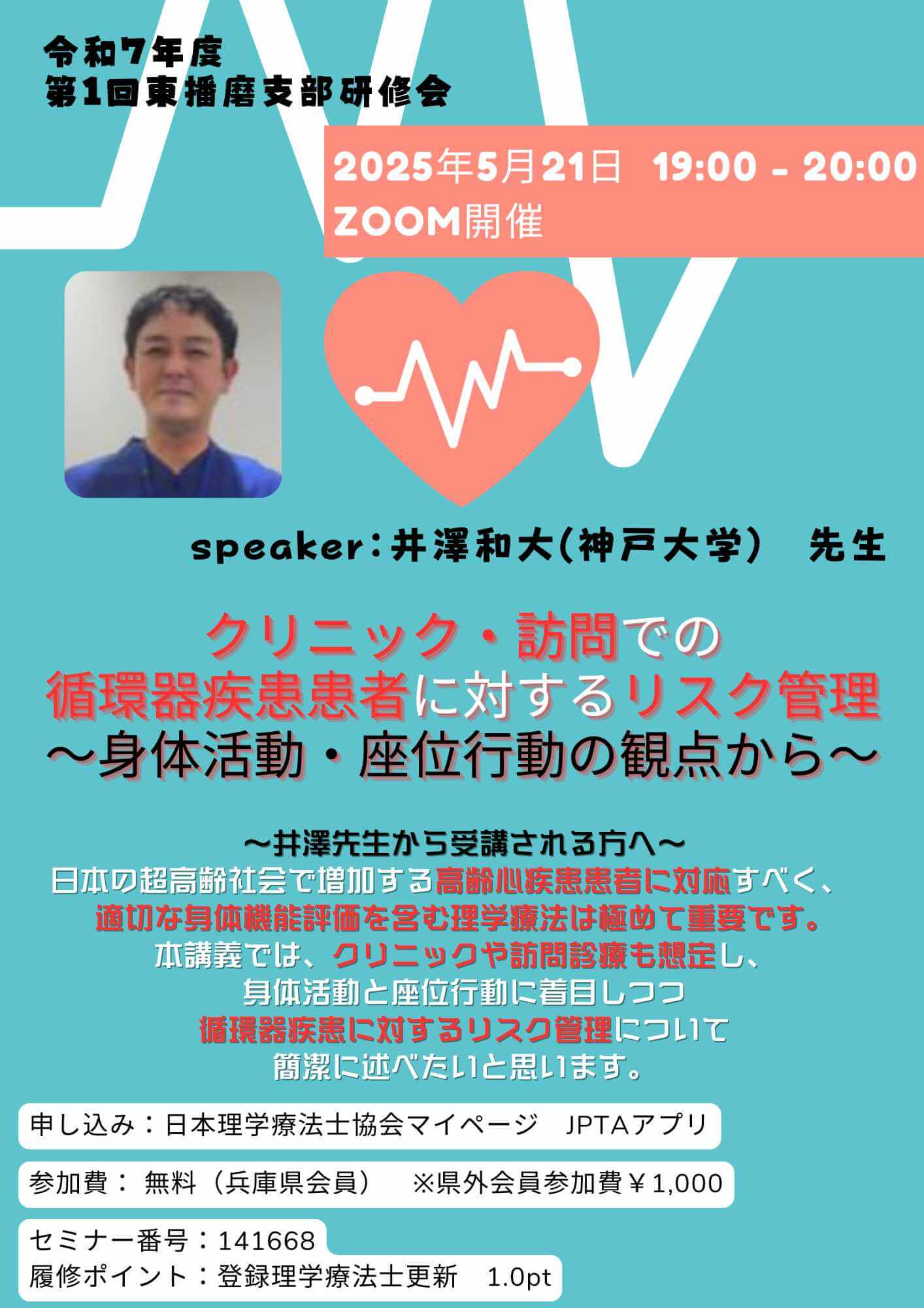 Home支部:東播磨令和7年度 第1回東播磨支部研修会のご案内2025 / 05 / 02令和7年度 第1回東播磨支部研修会のご案内日時: 令和7年5月21日(水) 19:00-20:00 WEB開催 テーマ:クリニック・訪問での循環器疾患患者に対するリスク管理~身体活動・座位行動の観点から~ 講師:井澤和大先生 (神戸大学大学院保健学研究科) 一覧に戻る前の記事へ一覧に戻る次の記事へ